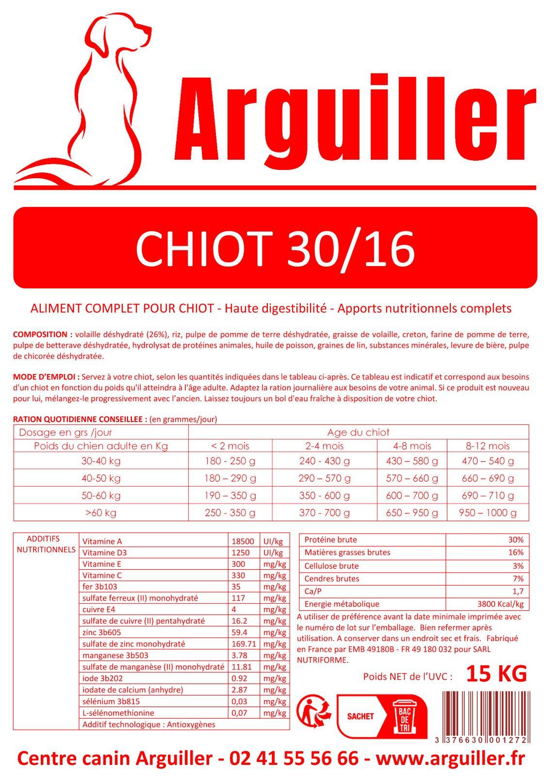 Servez à votre chiot, selon les quantités indiquées dans le tableau ci-après. Ce tableau est indicatif et correspond aux besoins d’un chiot en fonction du poids qu’il atteindra à l’âge adulte. Adaptez la ration journalière aux besoins de votre animal. Si ce produit est nouveau pour lui, mélangez-le progressivement avec l’ancien. Laissez toujours un bol d’eau fraîche à disposition de votre chiot.